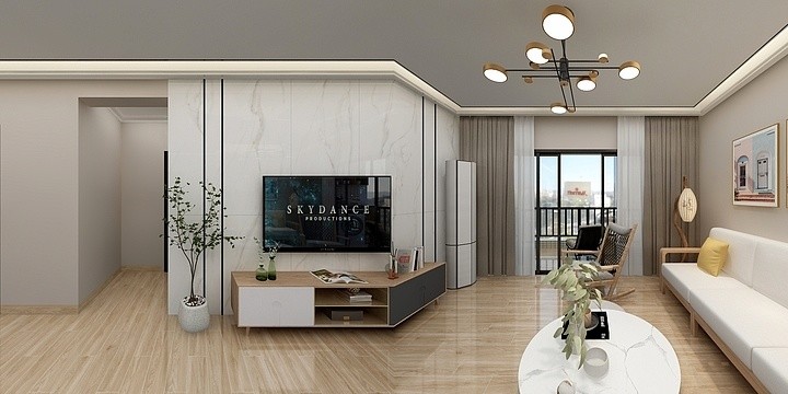 客厅整体设计简洁,没有臃肿的满墙储物柜,没有平铺的天花吊顶。干爽的大理石电视墙,搭配精致的金色包边,设计简洁层次丰富。