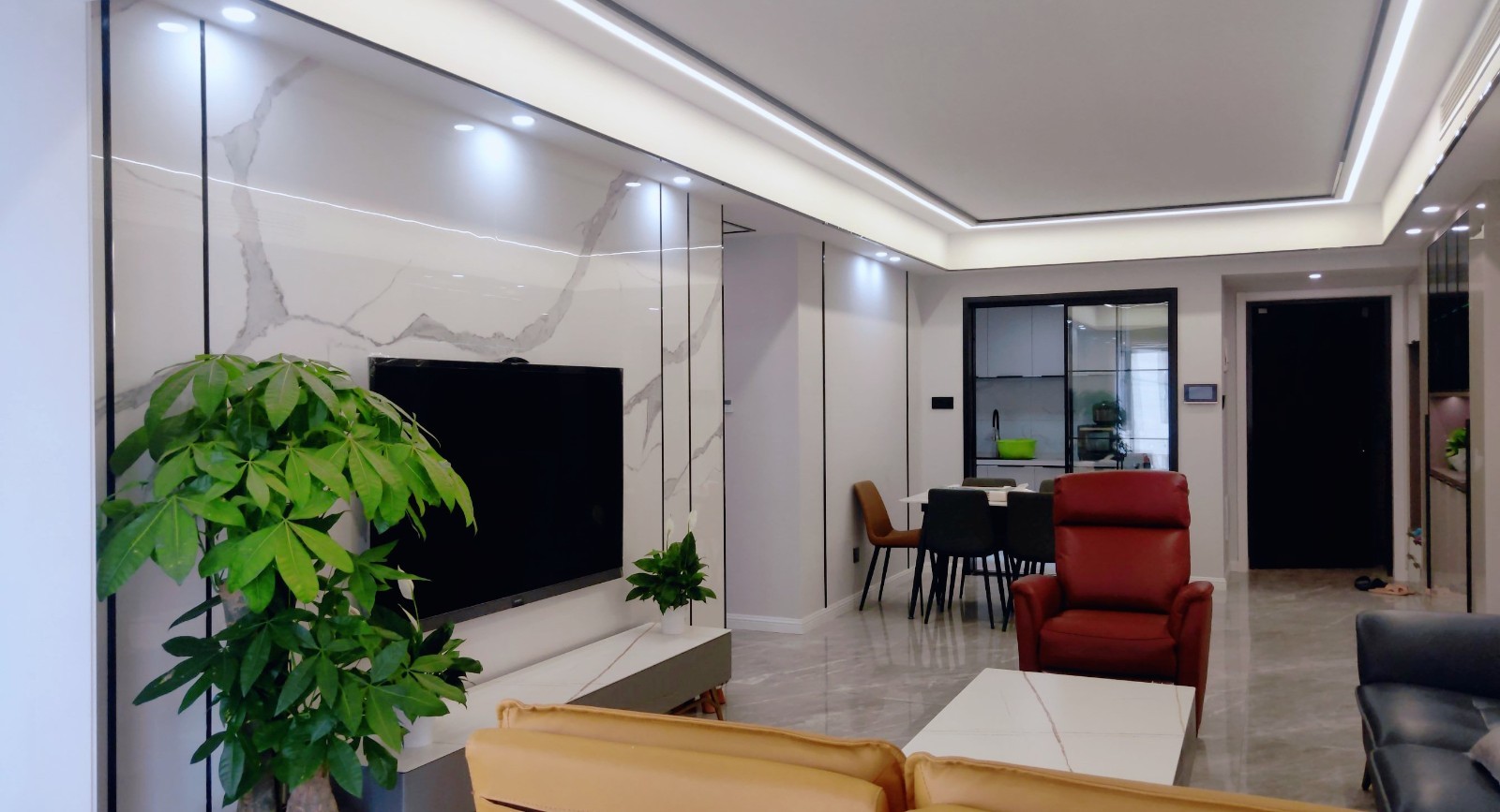 整个客厅充满大气的感觉,非常有质感,灯光设计搭配也是亮点之一!