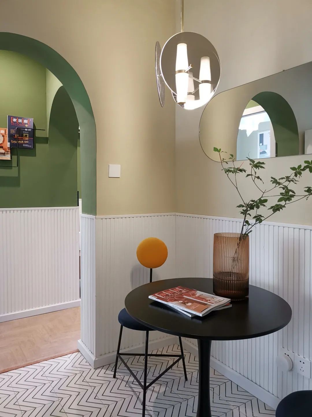 客厅背景选择了低饱和度的绿色,会比较耐看,由于整体空间也比较小,特意增加了护墙板作为过渡,也不会过于压抑。