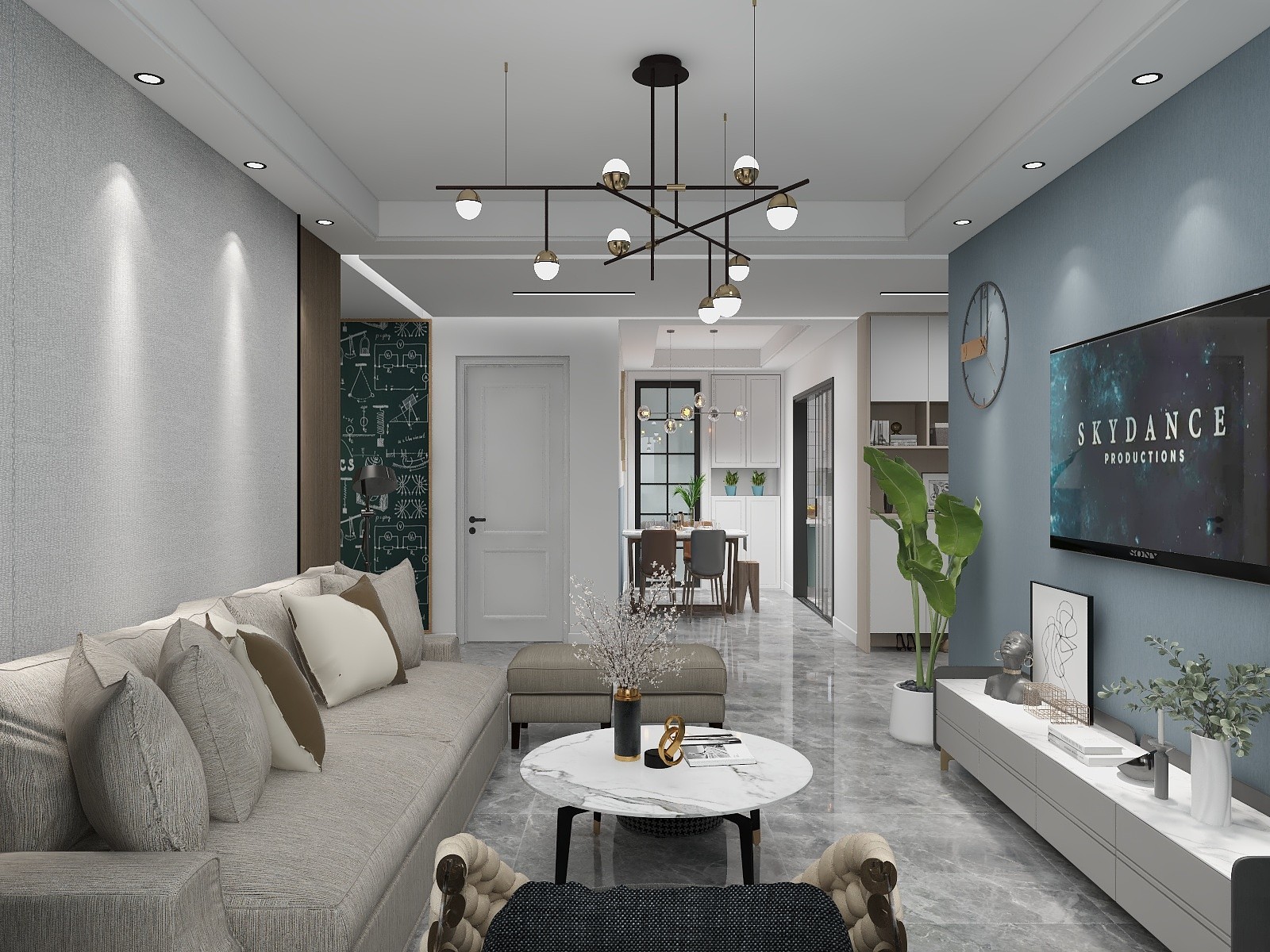 客厅做了直线吊顶,考虑到灯池比较藏灰,所以采用标准直销店顶加石膏板线。