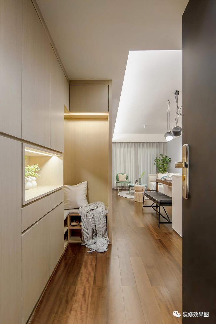玄关入口***满足的是收纳问题,原有结构的改动让鞋柜相对之前增加,中部的空余部分可以放置钥匙包等生活物品,转折的换鞋凳,和换鞋凳下方的拖鞋置放处,让空间的开放和封闭,都能满足。