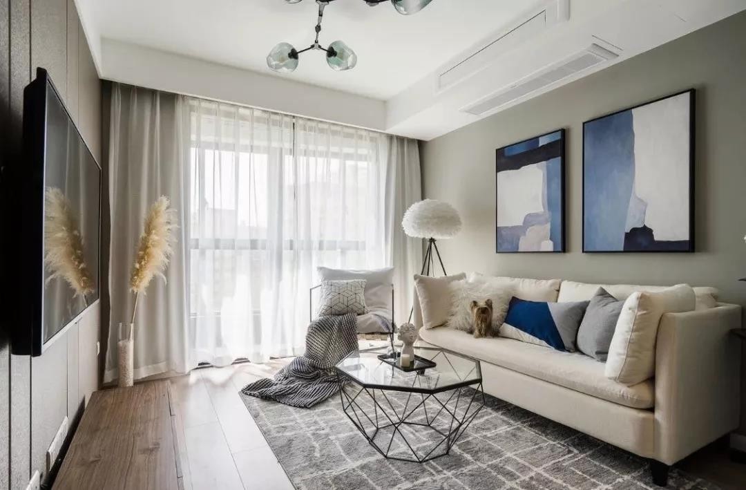 客厅和阳台之间用推拉门隔开,加上纱帘之后,显得更有仙气。暖灰色的背景墙和米色的布艺沙发结合,显得更加舒适。