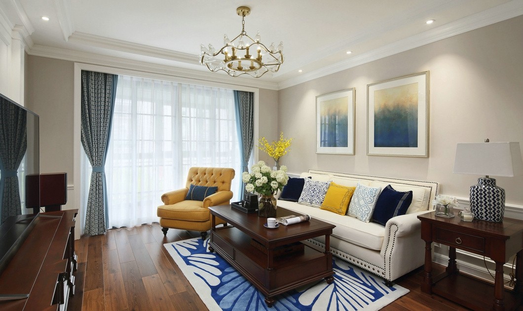 客厅墙面运用了黄色显示出整体气质,沙发墙面对称摆放了两个画框,显示出家人对艺术的喜爱。