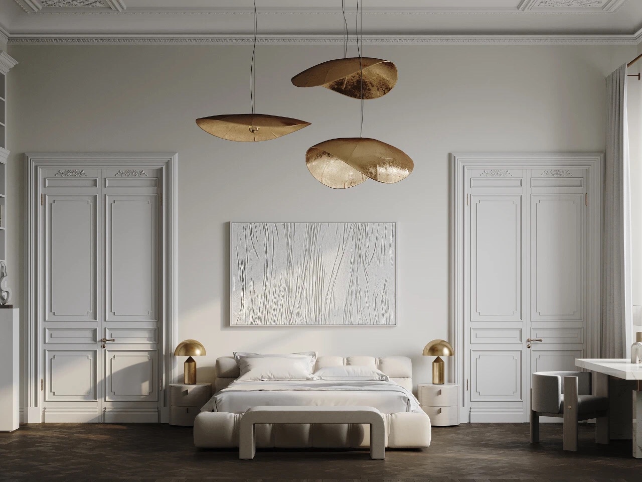 设计师依据这间豪宅的内部条件决定配色方案,专注于现代法国经典,为高天花板选择吊灯。