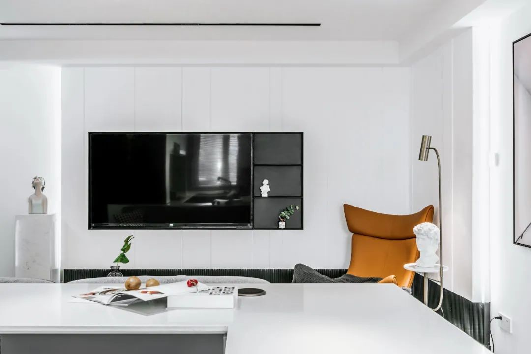 电视墙以定制柜的设计,白色柜体+黑色的背景与地台,嵌入到电视背景墙的电视机,