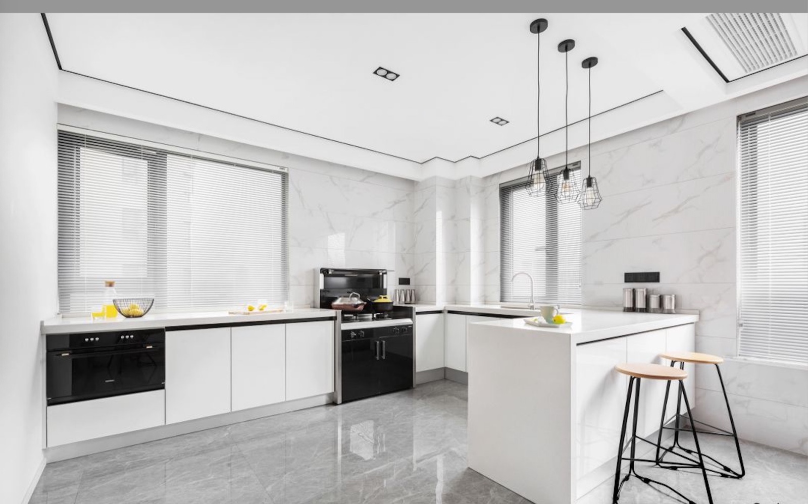 厨房采用开放式设计,灰色抛光砖地面+雅白墙面,还有白色的橱柜+中岛台组合,让厨房显得充满现代时尚的端庄氛围感。