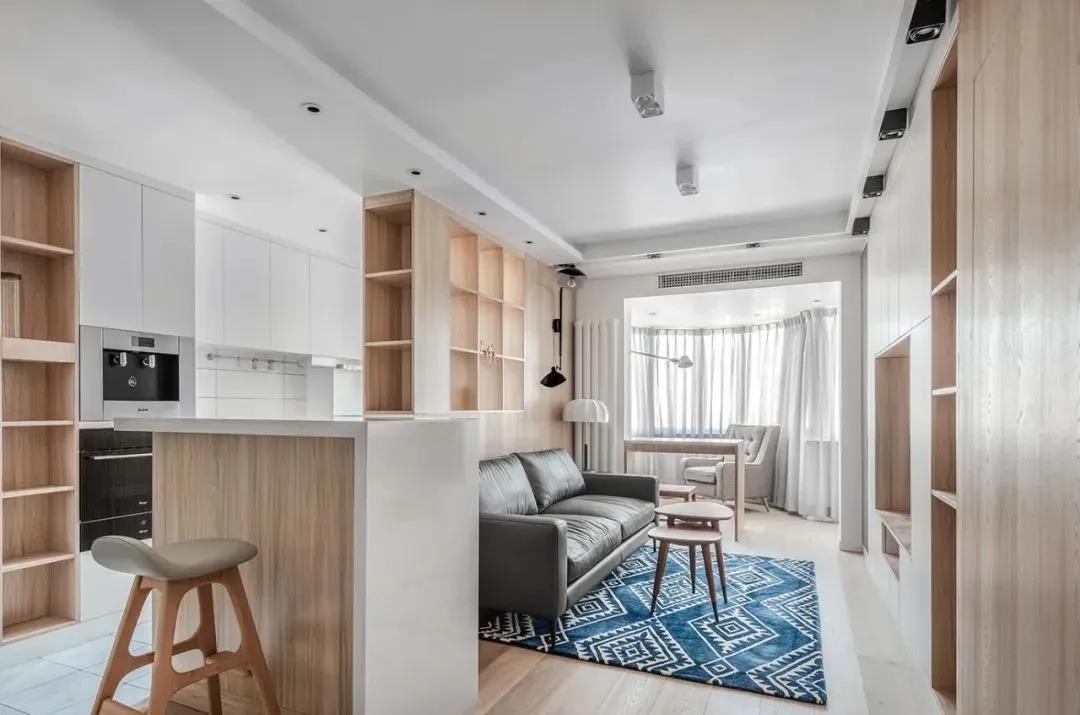 客厅,拆除了原有沙发墙,改用木质隔断+玻璃展示柜的组合代替,兼具了颜值与实用性。