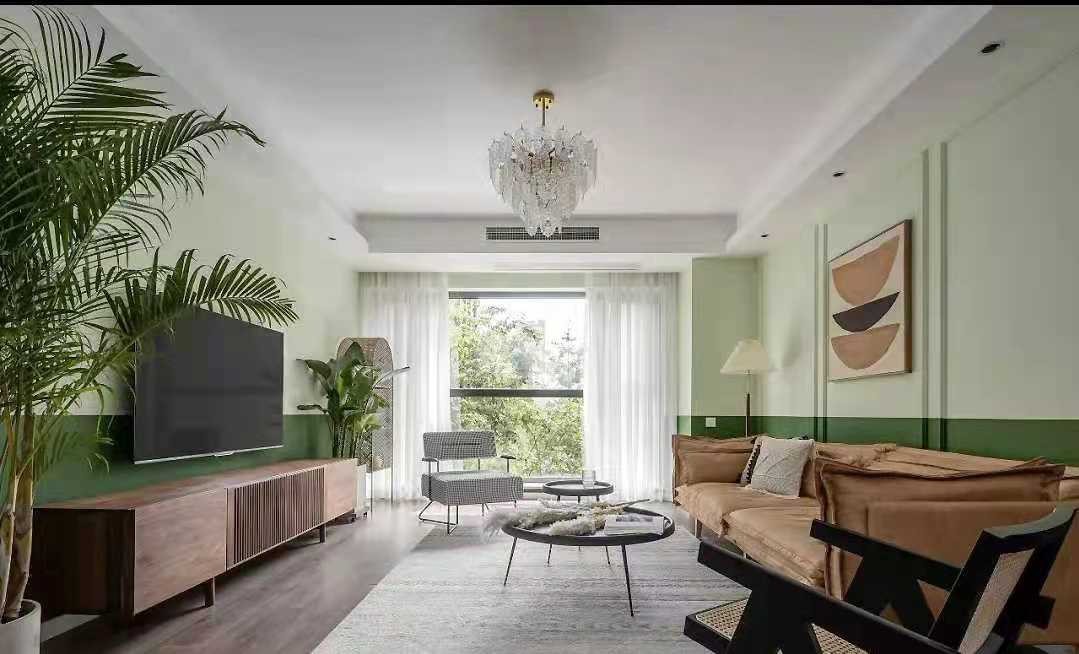 将观景阳台纳入客厅,使空间视野更加开阔通透,浅绿+深绿的分色半墙,加以透过落地窗看到的自然景观,带来森林般的清新氧气感。