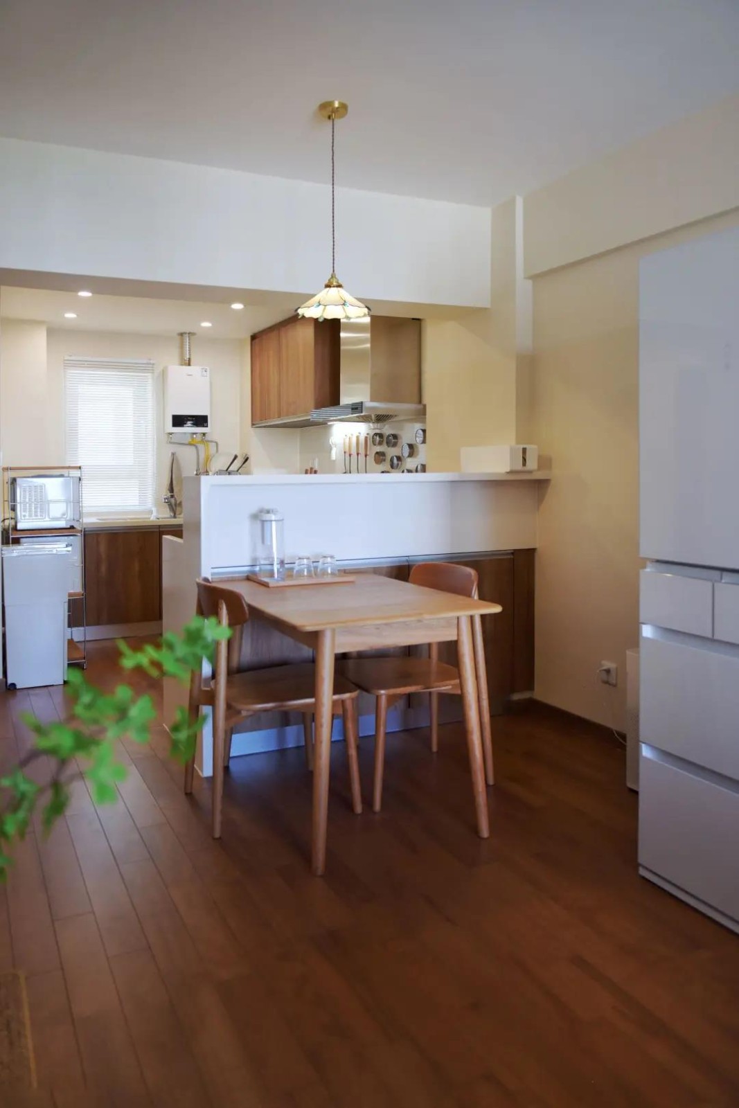 餐桌倚靠在厨房条台下,餐边柜的作用,可以储放和餐厨相关的用品。