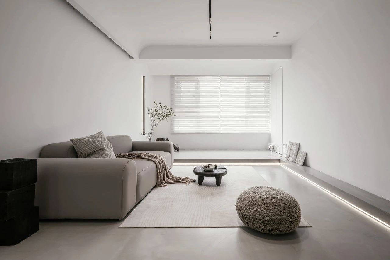 极简风的客厅,整体灰色地面+净白的墙面,布置上素雅的沙发、地毯,营造出一种简约舒适而从容的居住体验。