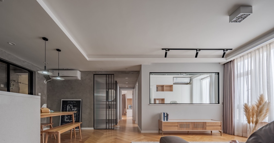 将厨房开放,干区墙体打掉部分以及书房与客厅的墙体做半开放,LDK一体让公共区域更加明亮开阔又大气。墙面刷灰色乳胶漆与微水泥,地面用橡木木地板增加温暖感,鱼骨拼的木地板使空间更具有层次感