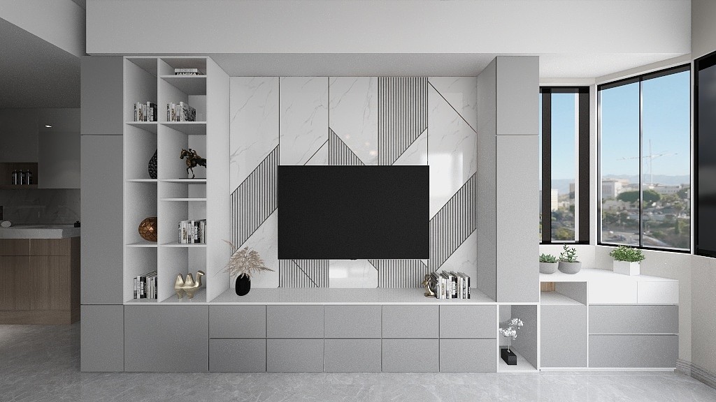客厅电视背景墙使用不规则灰白线条组成,装饰柜与阳台矮柜形成呼应
