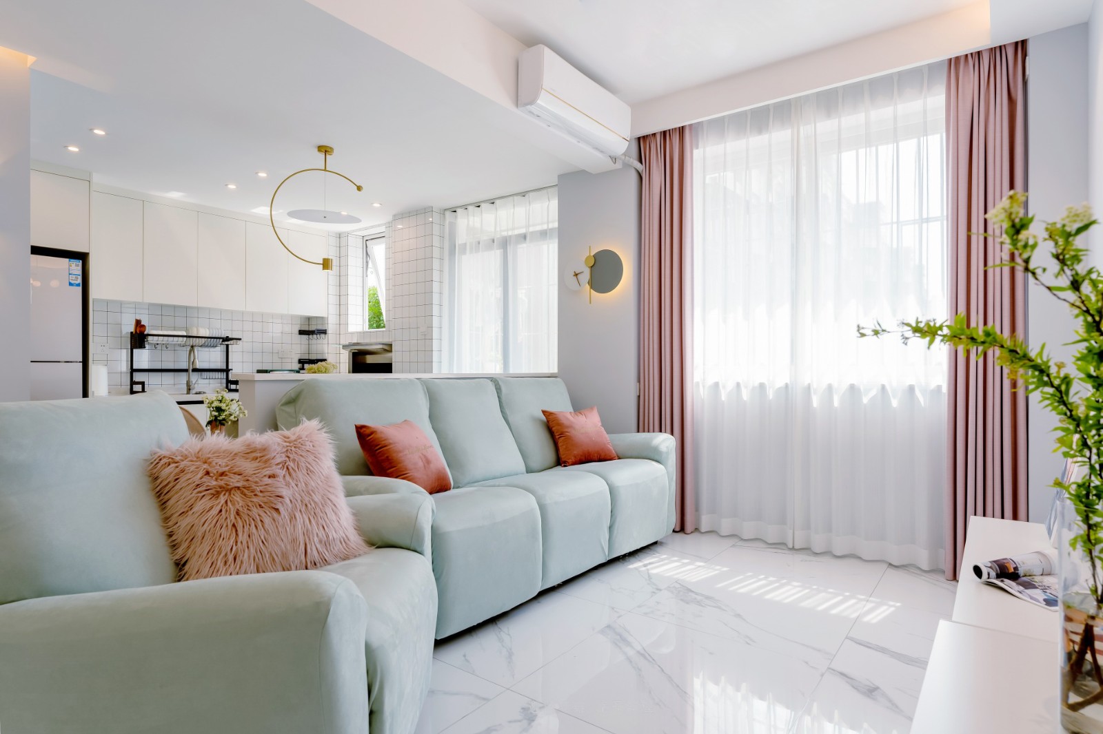 改造后的客厅餐厅厨房都能有光线直接招进来,阳光洒在沙发上,感觉多舒服呀,业主频频称赞觉得简直太棒了,就是想要这种感觉,通风也变得很好,开了窗户,风吹起窗帘简直不要太舒服!