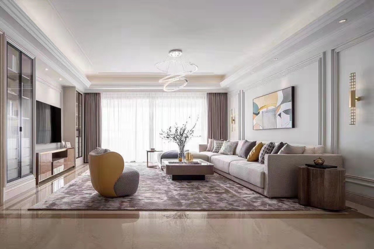 现代美式风格,采用了简洁的石膏线勾勒风格,顶面采用回形吊顶