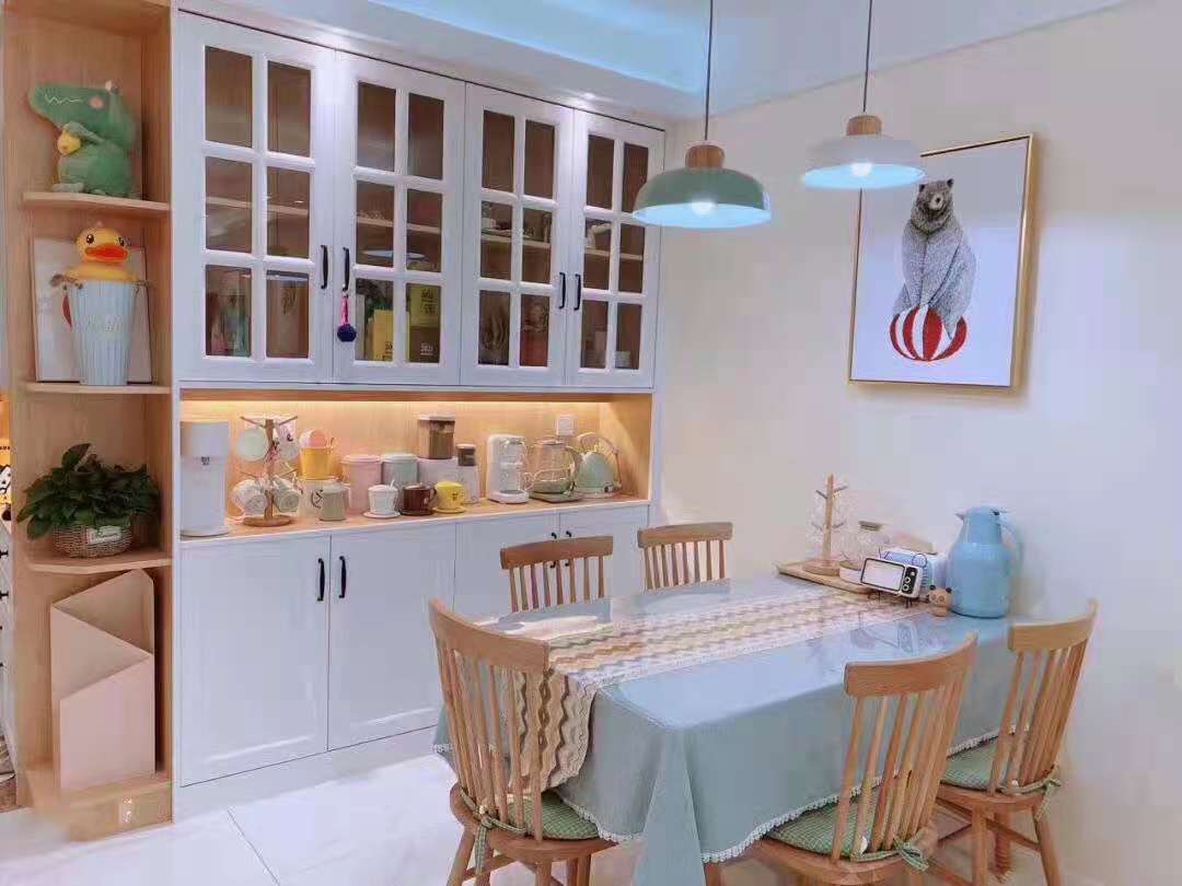 餐厅由原木为主,搭上白色调,浅蓝色为辅。