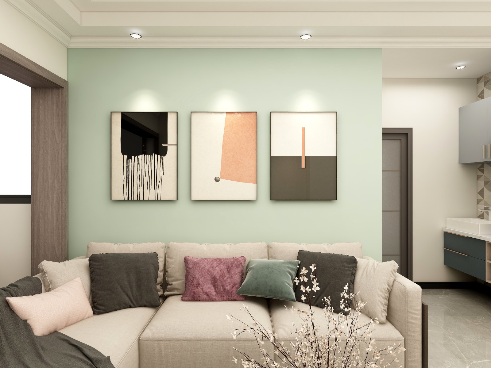 客厅采用了小清新风,年轻又时尚,搭配帆布沙发和艺术壁画