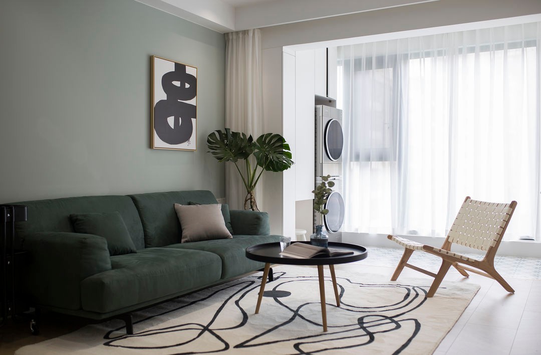 硬装和家具多以低饱和度色彩为主,唯独沙发例外选用了深绿色,在空间既复古又***,质感也很好。