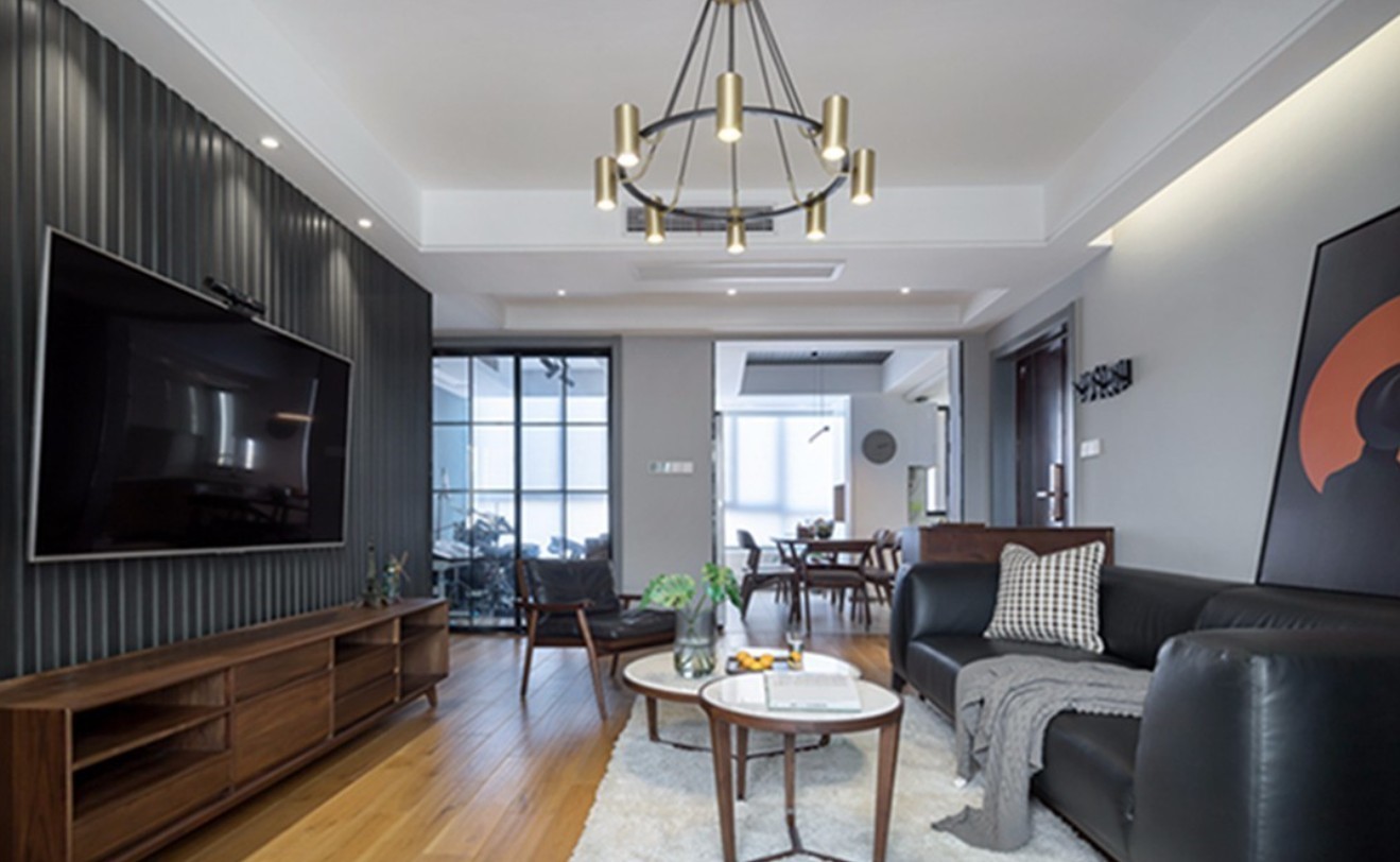 客厅以黑白灰为主色调,浅木色地板搭配黑色皮质沙发、胡桃木家具,无不彰显了主人对生活品质的追求。柔和的阳光透过浅灰色的窗帘,给整个客厅营造了一种朦胧美。