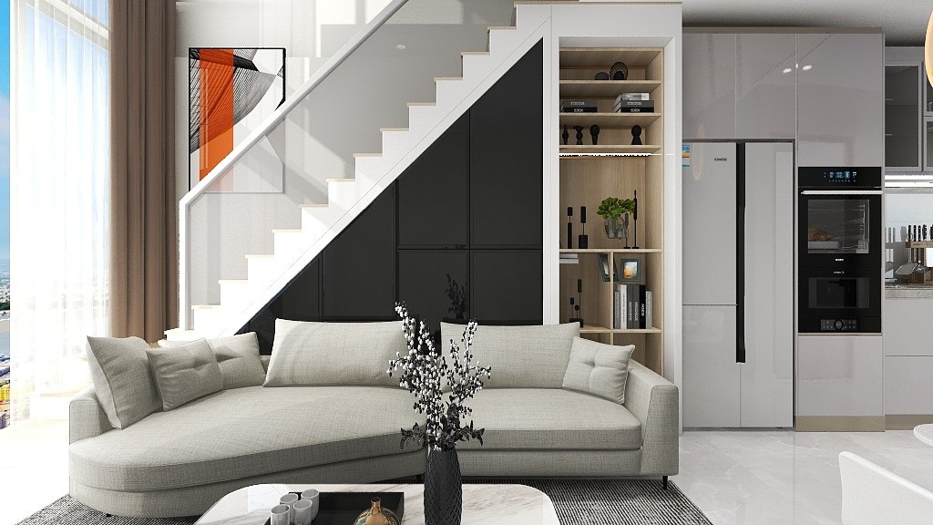 一楼整体采用工业混搭,楼梯下增加储物空间