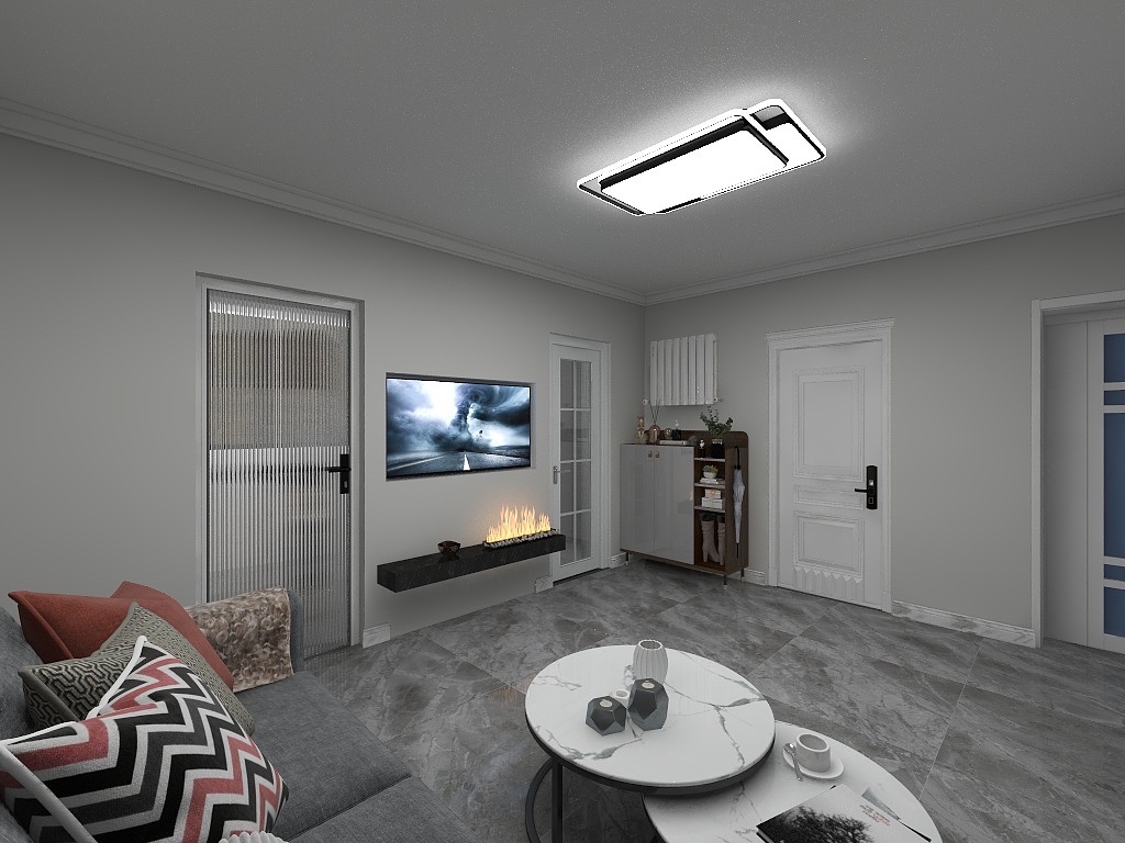 浅灰色地砖搭配白色茶几和木门