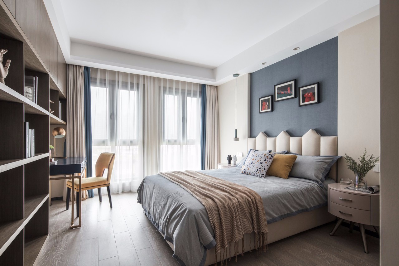 主卧的背景墙做了咖色,如同一个质朴的贵族,随和却不平庸,特有的质感打破空间的寡淡