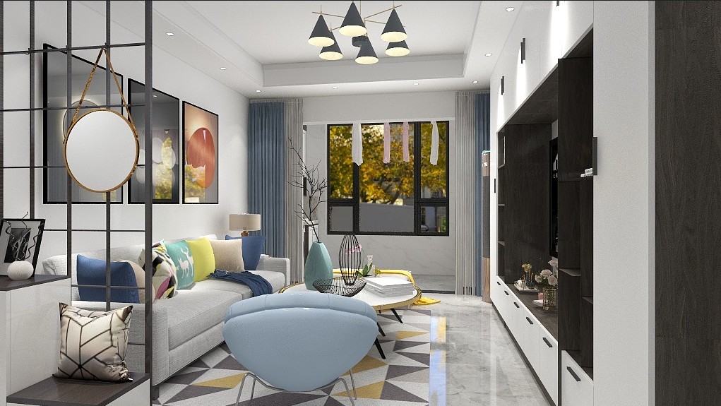 客厅双眼皮吊顶,书柜两用,合理利用空间,客厅外接飘窗,与自然零距离接触