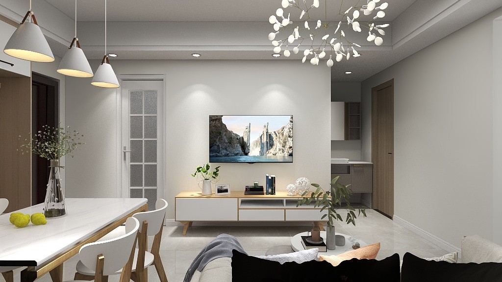 客厅餐厅一体化,餐桌采用原木色,氛围感满满