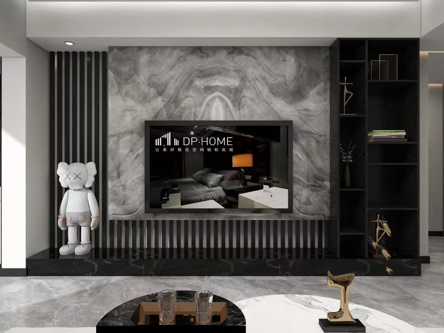 木格栅与大理石背景提升视觉享受,立柜增加储物空间,既好看又实用