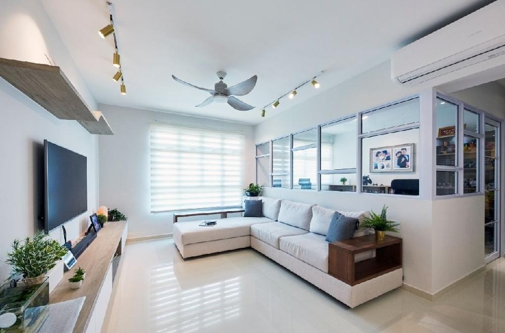 客厅:大面积米白沙发,全白背景墙,电视柜上有增加储物和展示架,功能性多样。