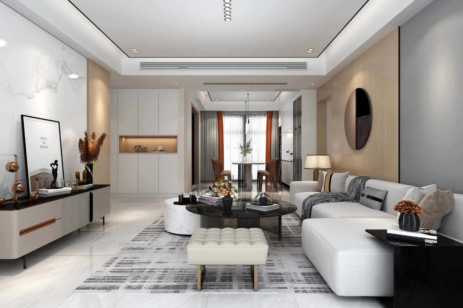 客厅以简洁明快的设计风格为主调,简洁和实用是现代简约风格的基本特点,电视背景墙采用爵士白大理石,既简单又大方,再加上沙发背景的浅色木饰面色彩(属暖色调),配上顶部照下来的灯光,整个客餐厅空间既大气又舒适。