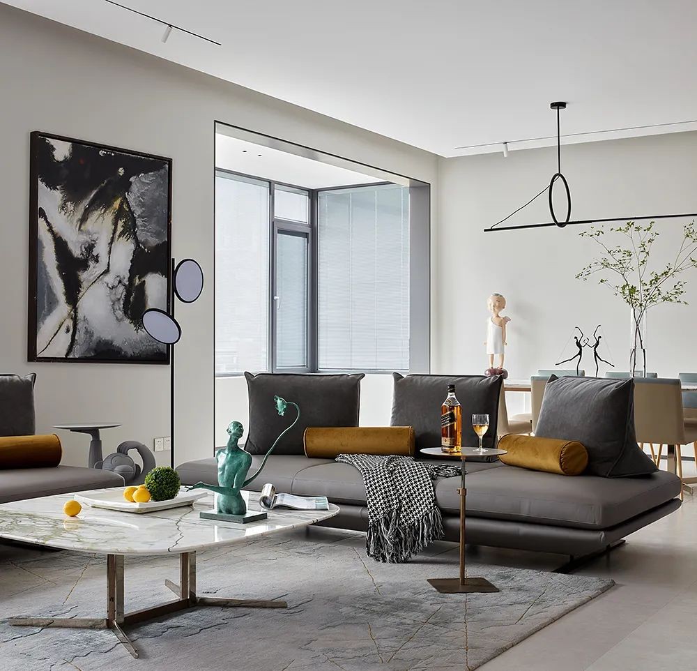 客厅的大理石电视墙+柜通体设计,会增加整个空间的实用性,不仅整洁美观,而且避免了长时间带来的“藏污纳垢”问题,减轻日常打理麻烦;定制吊灯嵌入式的设计,使得空间挑高不受影响,简约又不失个性。