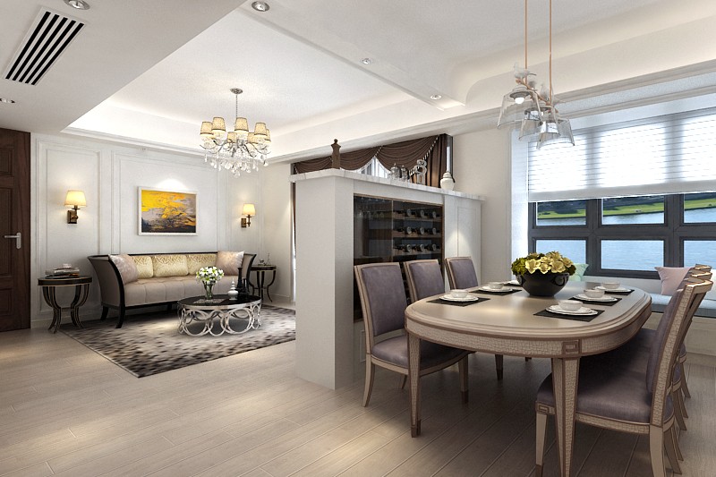 美式客厅风格主色调以白色为主,沙发背景采用了装饰线条油白色漆,以半矮酒柜为客厅和餐厅之间的分隔线,电视背景柜具备了电视柜和餐边柜的功能。搭配精致的水晶吊灯,营造出一种怀旧、浪漫的感觉。