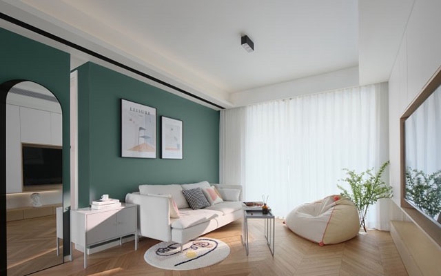 不同色彩的运用将公私区域做了清晰的区,与安静大气的灰绿不同,卧室背景墙用粉红色营造出甜蜜欢快的氛围!