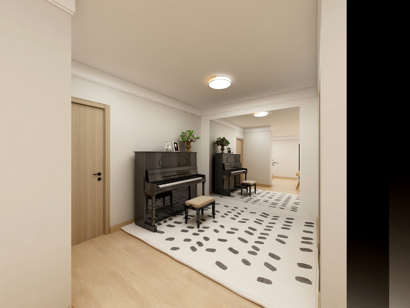 主卧和次卧缩减出来的区域做了儿童活动区,墙面做了舞蹈练习的满墙镜