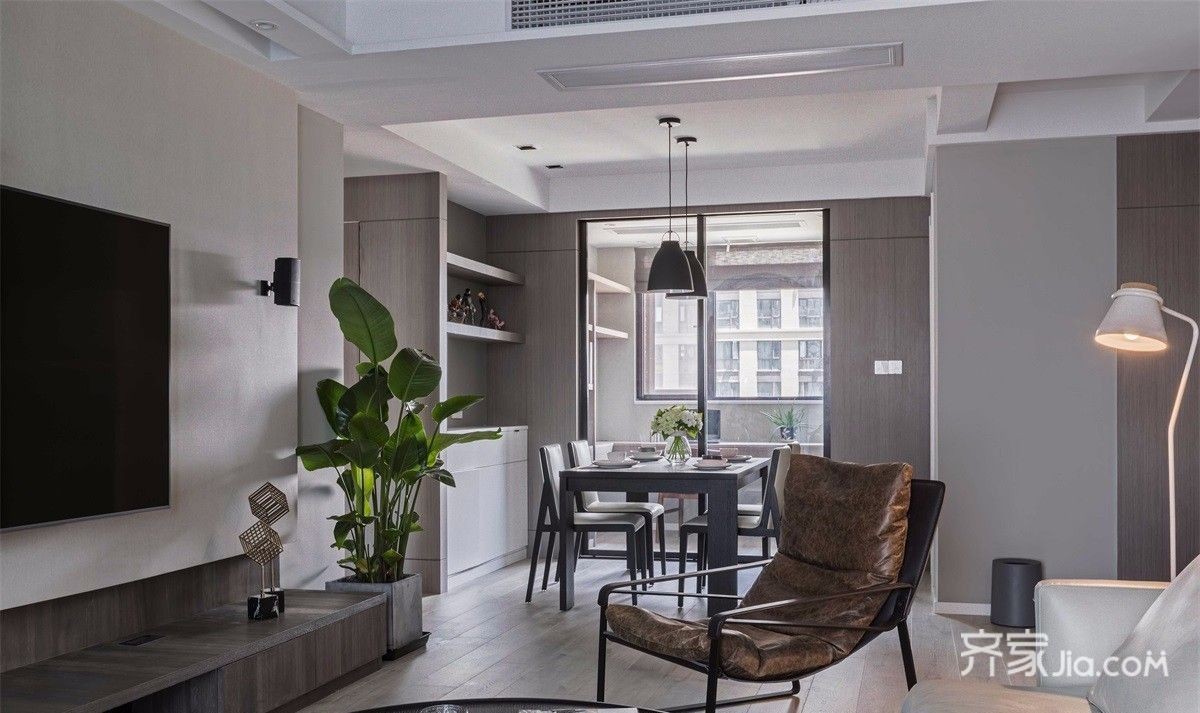 白色的皮质沙发冲淡了暗色家具的沉闷,线条感十足的挂画和点缀的绿植使空间生动起来。