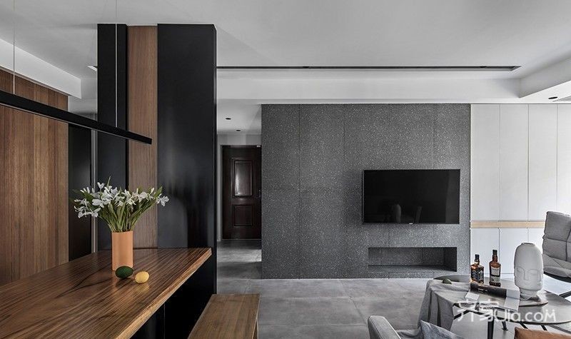 电视背景墙材料的选择上则选用颜色更深的水磨石砖来体现台式粗犷的一面。