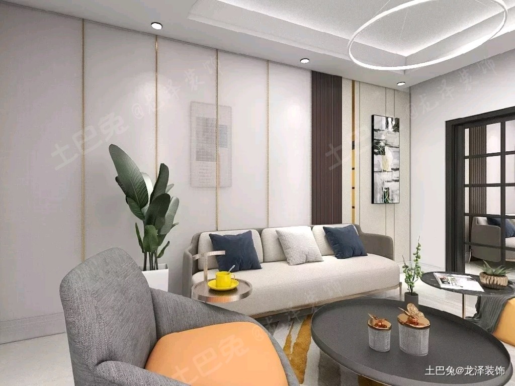沙发背景墙运用集成墙板贴面,在集成墙板的接 缝处运用五毫米宽金属收口,并加以长城板做跳 色。清爽,与电视背景墙相呼应