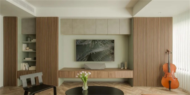 电视墙区域,利用内退空间定制一整排深度60公分的收纳柜,纵向高柜是柚木色槽板柜门,通过槽板和柜体的排列组合,增加空间层次同时解决客厅空间收纳问题。
