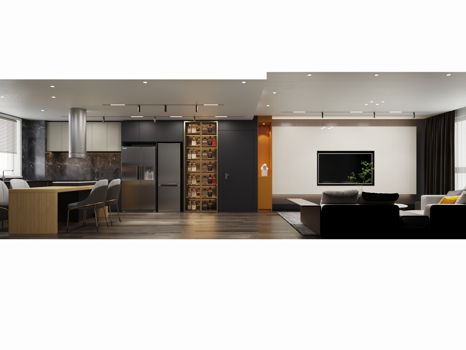 岩板和欧洲进口板材护墙板相互搭配... 阿玛尼橘黄色进口板材制作拜访陈设物的小柜...
