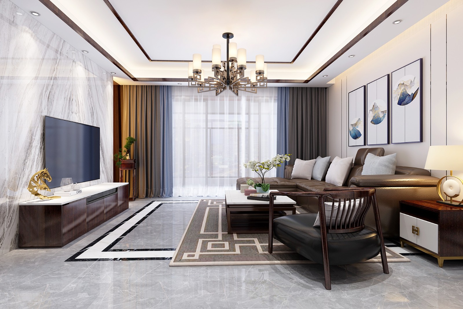 因为是新中式的风格,所以整体没有用特别跳跃的色彩,都是一些传统的颜色。