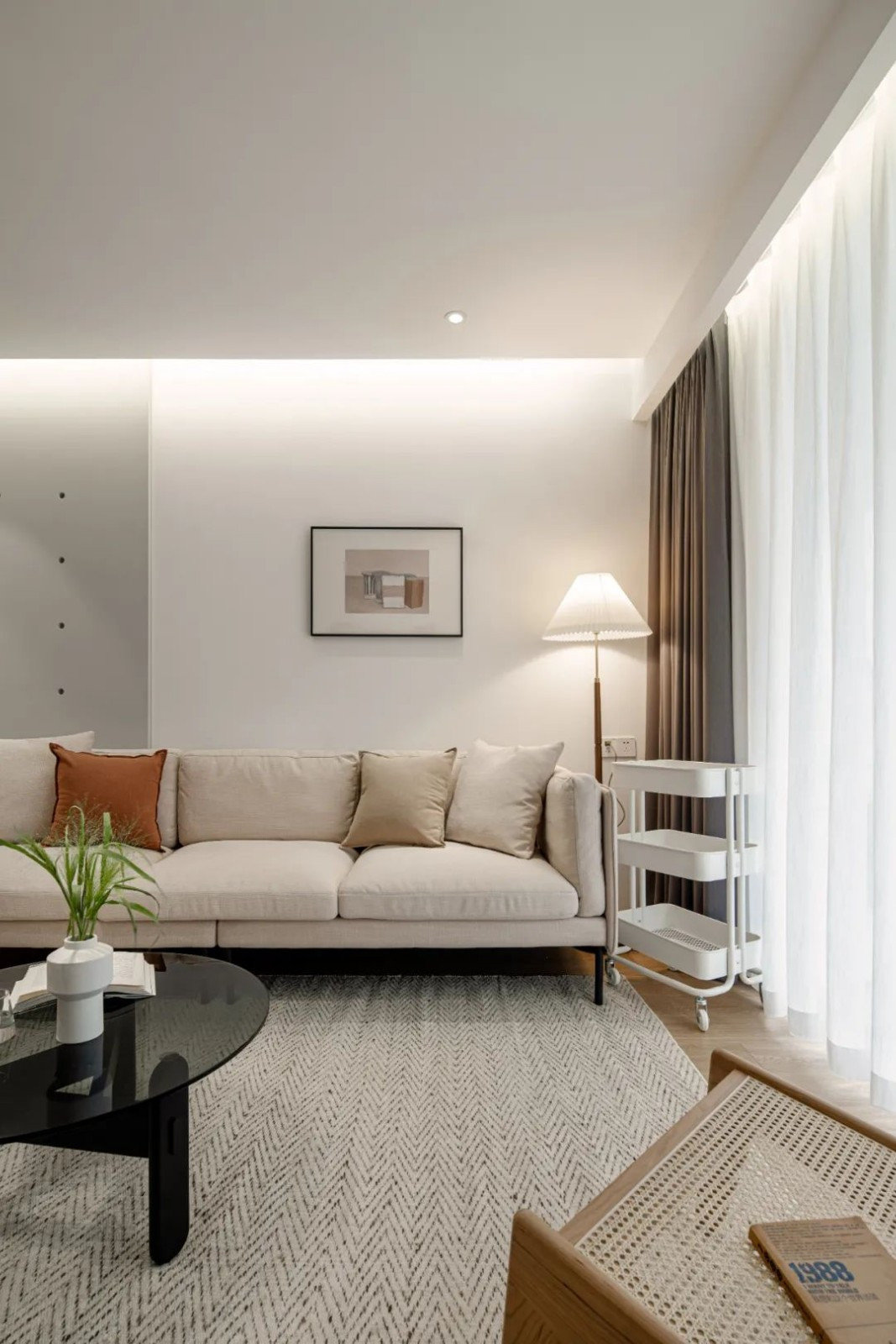 无主灯设计,采用弱光源补充。灯带,筒灯,落地灯的结合。