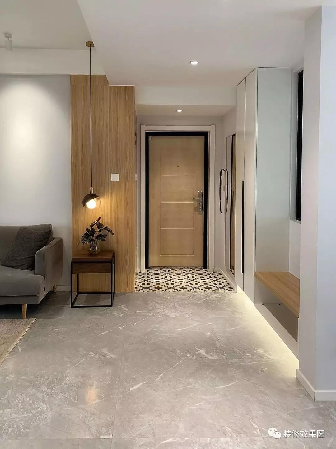 入门一张几何地毯,在视觉上增添空间层次感。一块横木板充当换鞋凳,简单随性,底部留空的方式,便于日常放置鞋子。