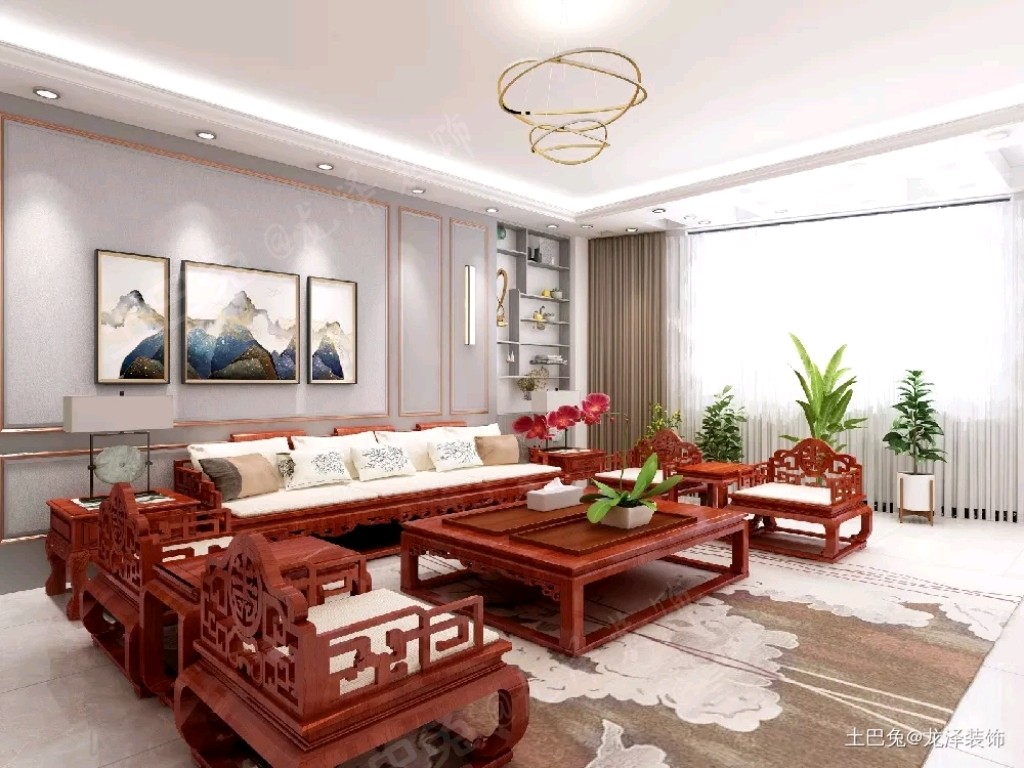 沙发用红色木质沙发,阳台做钢琴型吊顶。