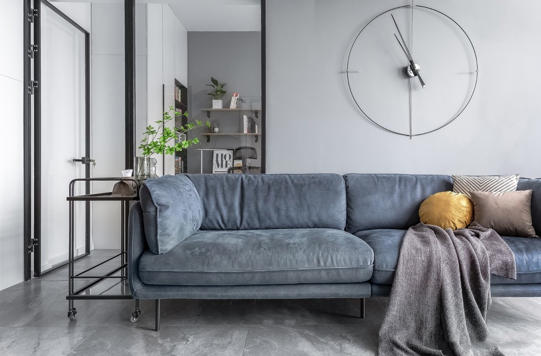 沙发背景墙干干净净,仅用镂空的创意挂钟装饰墙面,增添空间趣味性。沙发右侧是可移动置物架,方便随手置物。