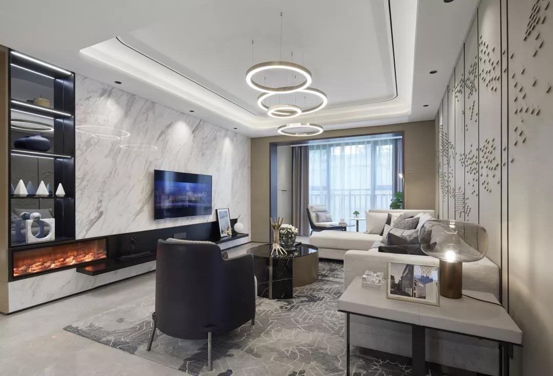 客厅的电视背景墙做了整墙大理石的设计,在大理市中间留出一部分做了嵌入式的展示柜和隔板电视柜,加上藏光看起来更加大气。