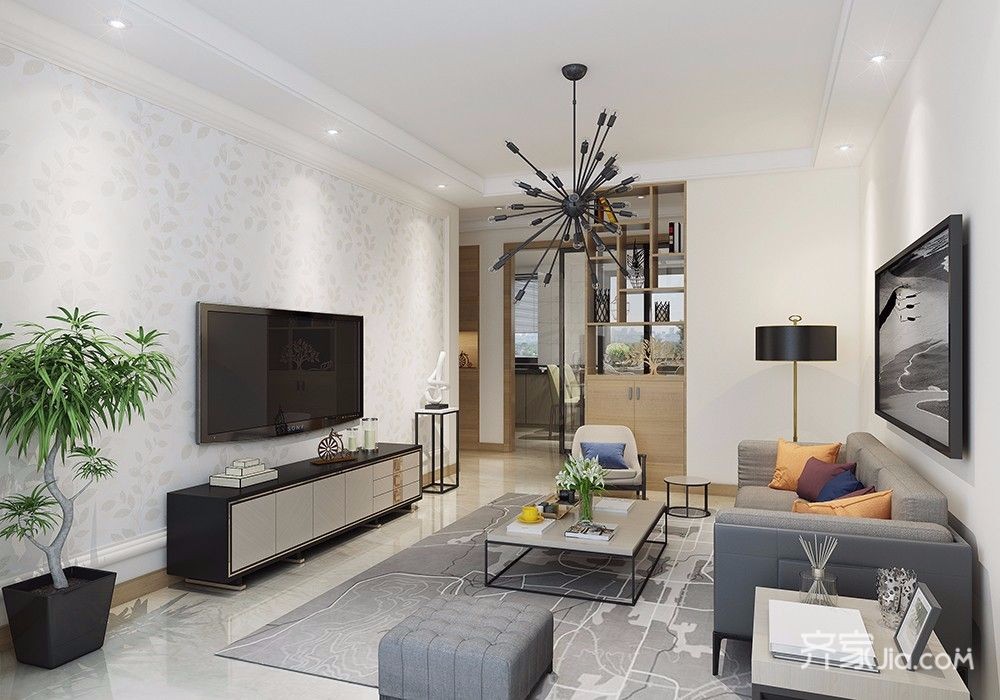 现代人的生活方式都以简约为主,不喜欢复杂的居家环境,在本案中,客厅顶面与墙面都没有做过多的装饰,以简单自然为主,白色的顶面、墙面与米黄色的地面共同营造了简约自然的居住环境。