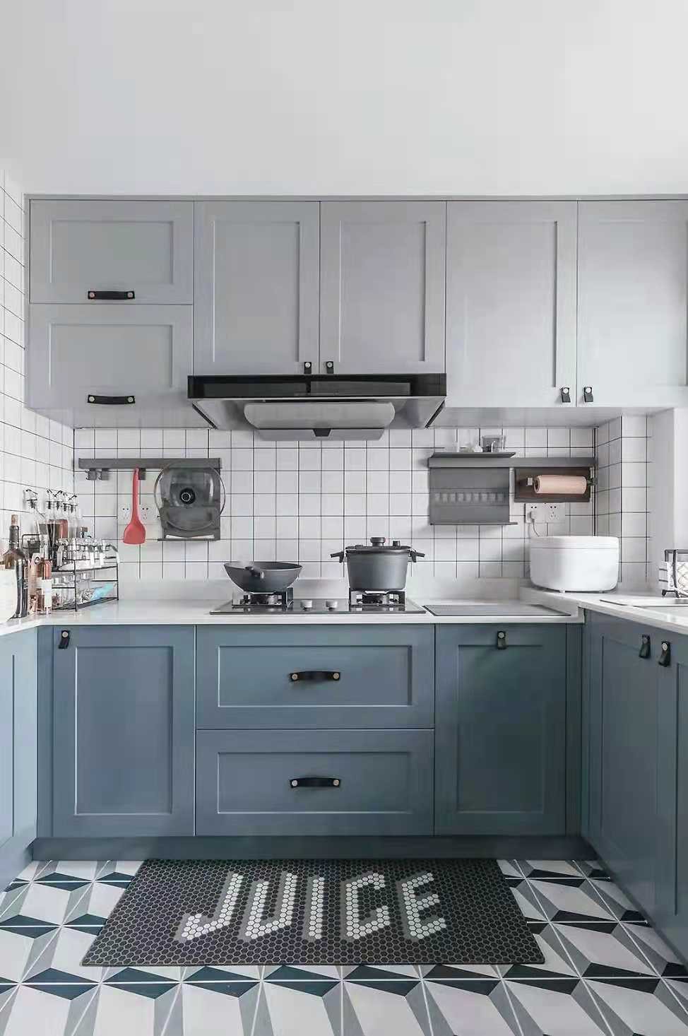 灰蓝色橱柜线条流畅,有点复古味道,但花样独特的地砖又带来几分新潮和艺术美,两者相交,别有趣味。