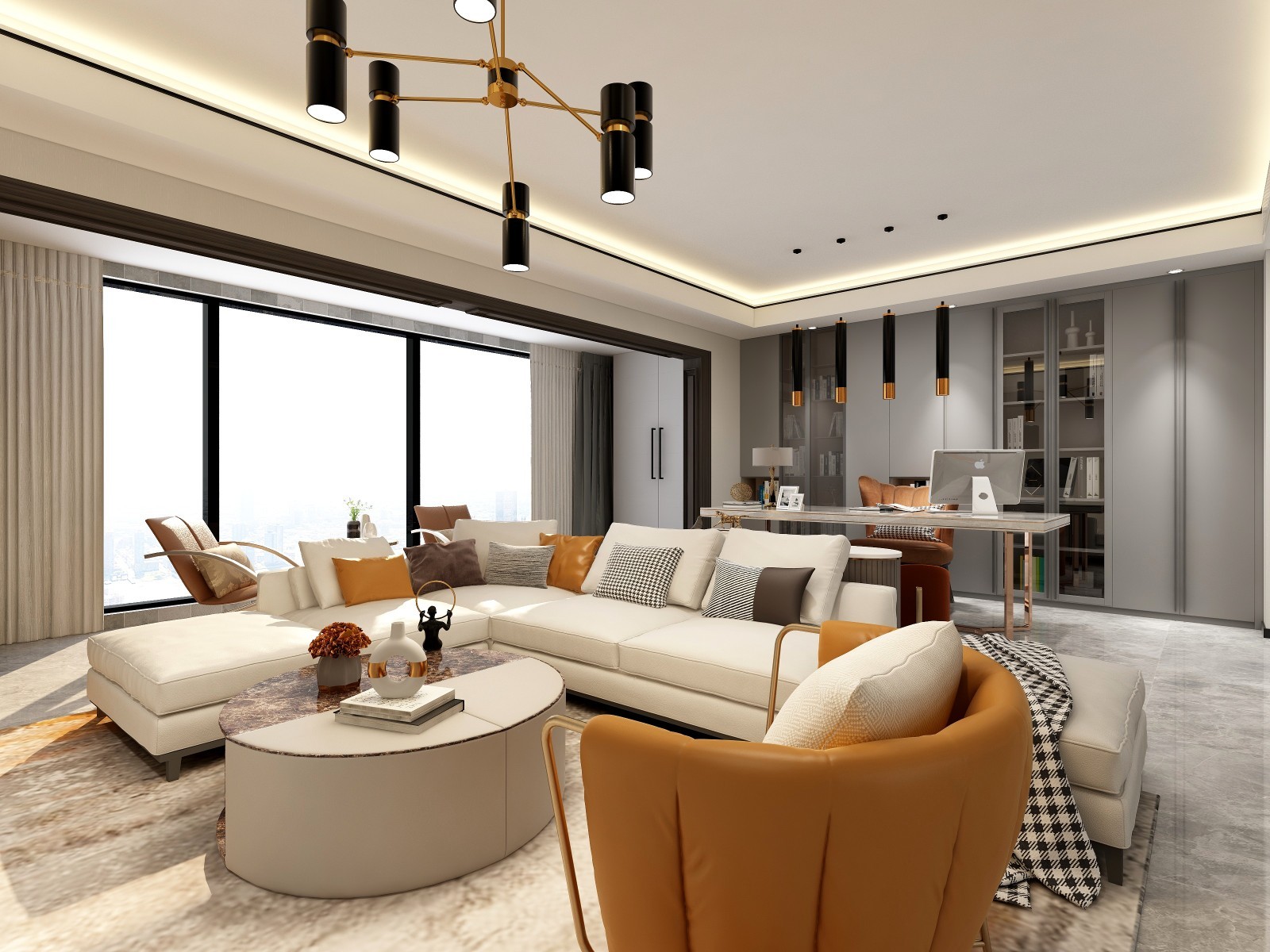 客厅空间,运用橙色作为跳色,多处用在沙发抱枕,坐椅,挂画,灯具等体现出来,灯具用的是金属材质元素的调色