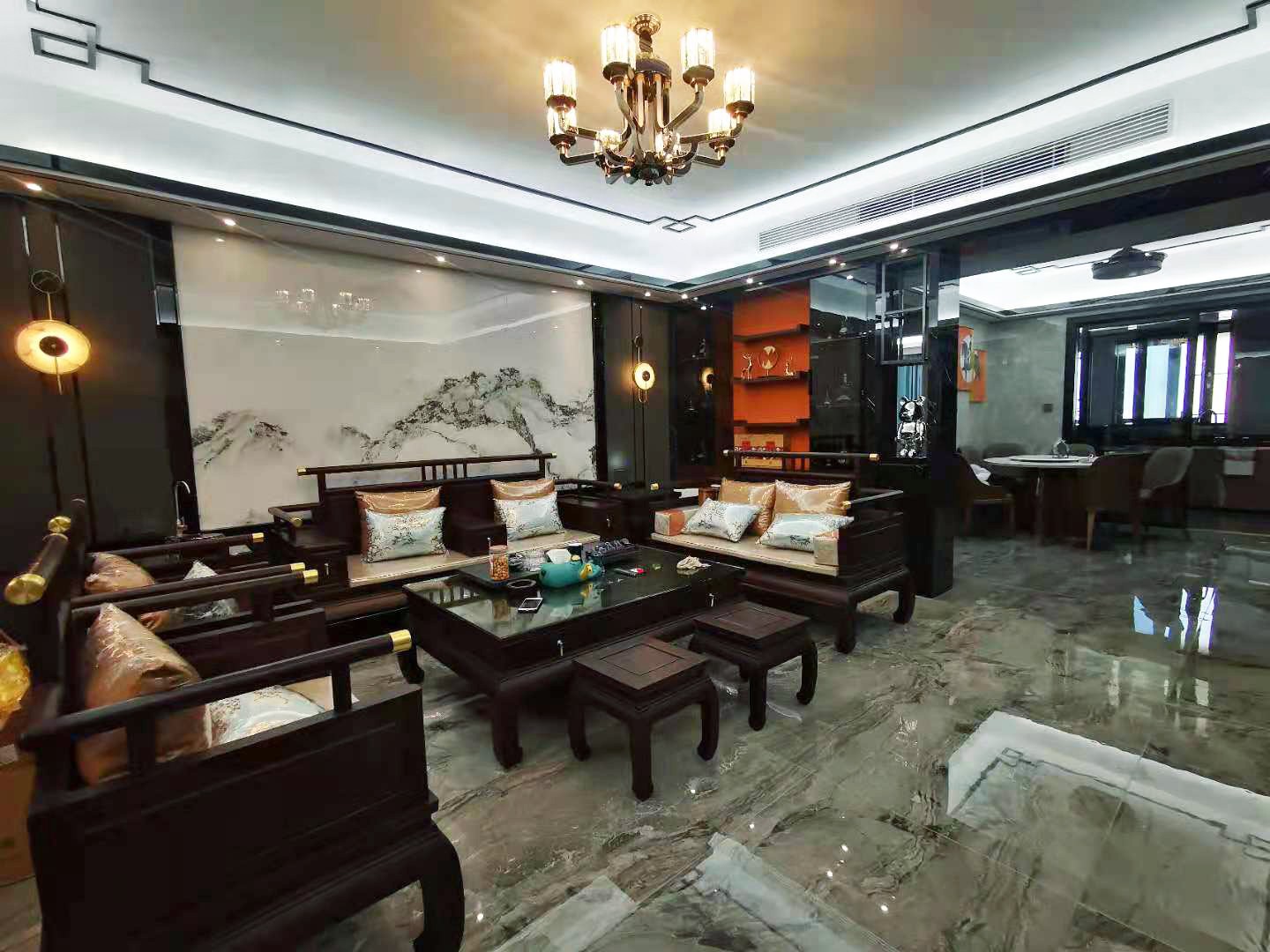 山水画背景石板瞬间将空间主人带入古典世界,新中式风格的韵味颇为浓郁。