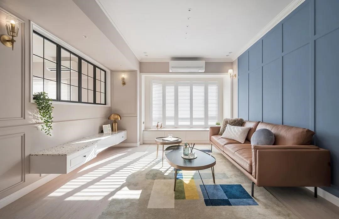 墙面选用淡奶茶色搭配线板温润舒服沙发背牆切换成莫兰迪蓝及线板装饰空间视觉有了主轴以暖色蓝配上柔和奶茶色还有浅色超耐磨木地板,勾勒居家自在感
